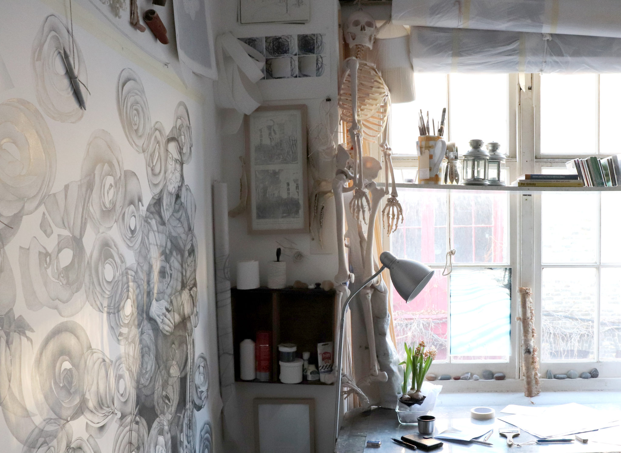 “It [the space] has an effect on that [the sort of work I make], sure it does…but it doesn’t in a way I’m still managing to do big pieces, though it's not easy, just getting a piece of paper up is a bit of a challenge, but it's fine. I would also love to have space which is clean, and it needs to keep clean, because the trouble with here is that this is kind of floor you can't keep it clean easily so I can't let anything drop on the floor [...] it might be that the drawing is destroyed. Even though paper is easy to store, you’ve got to be careful handling it here.”